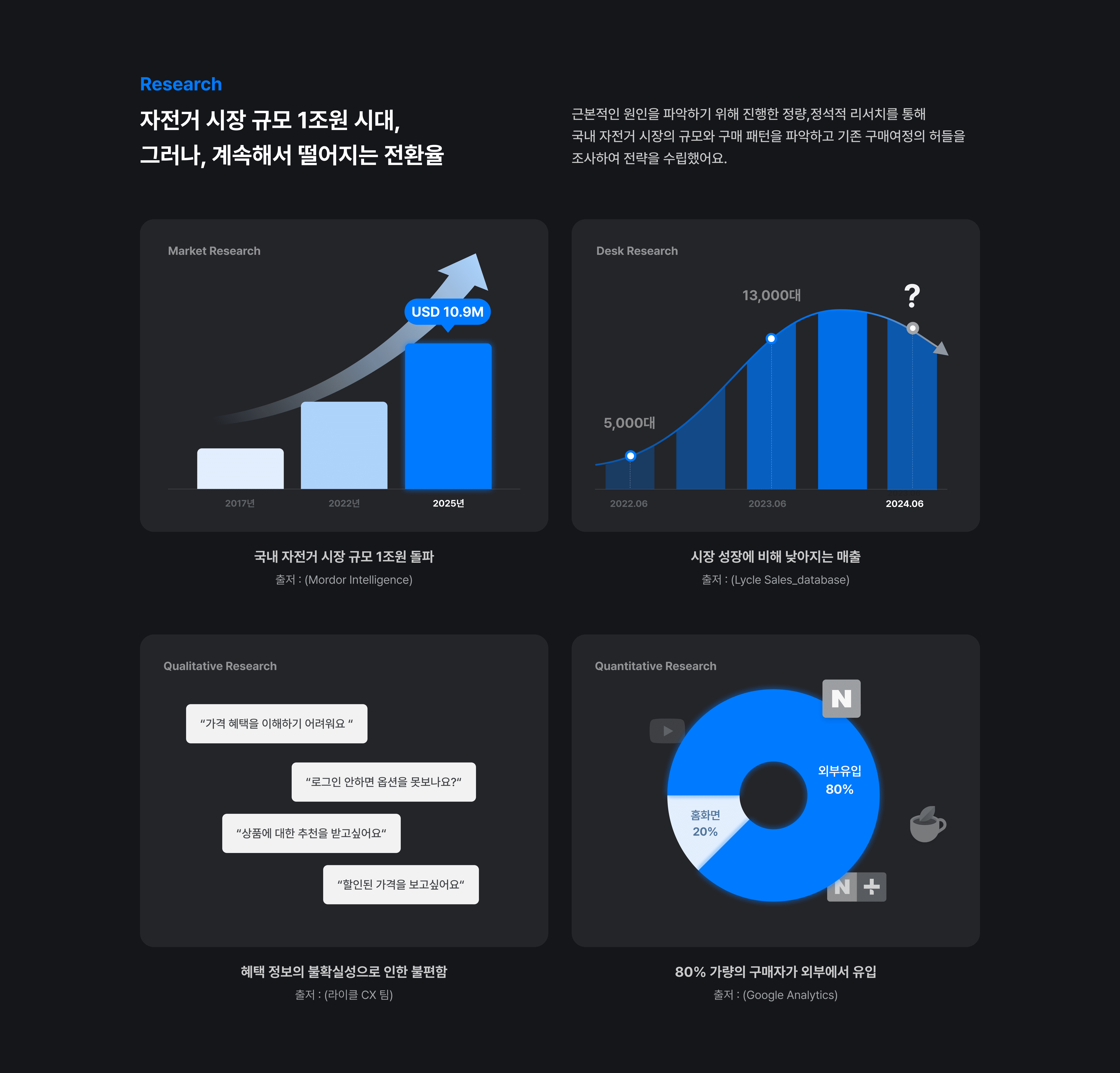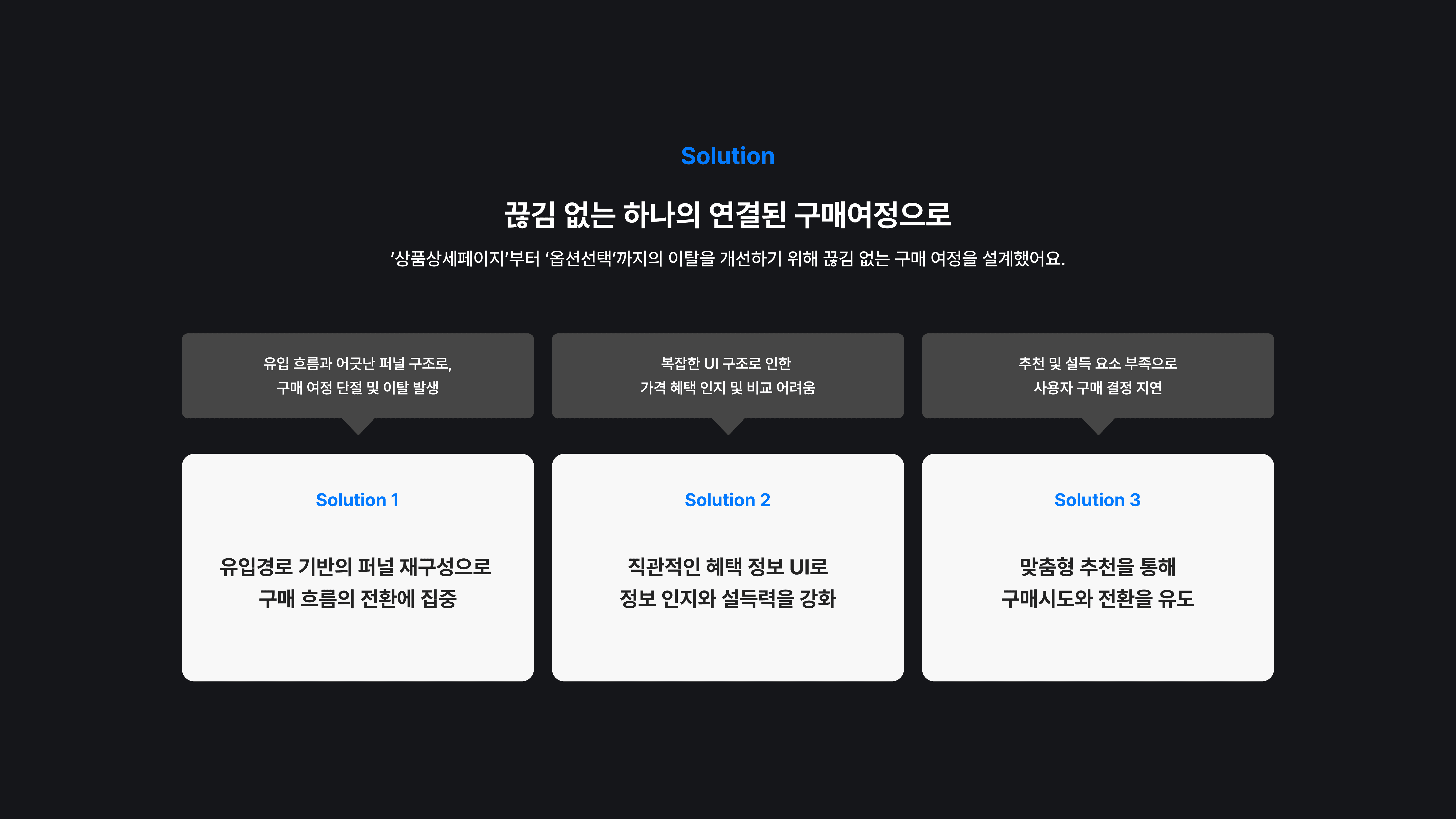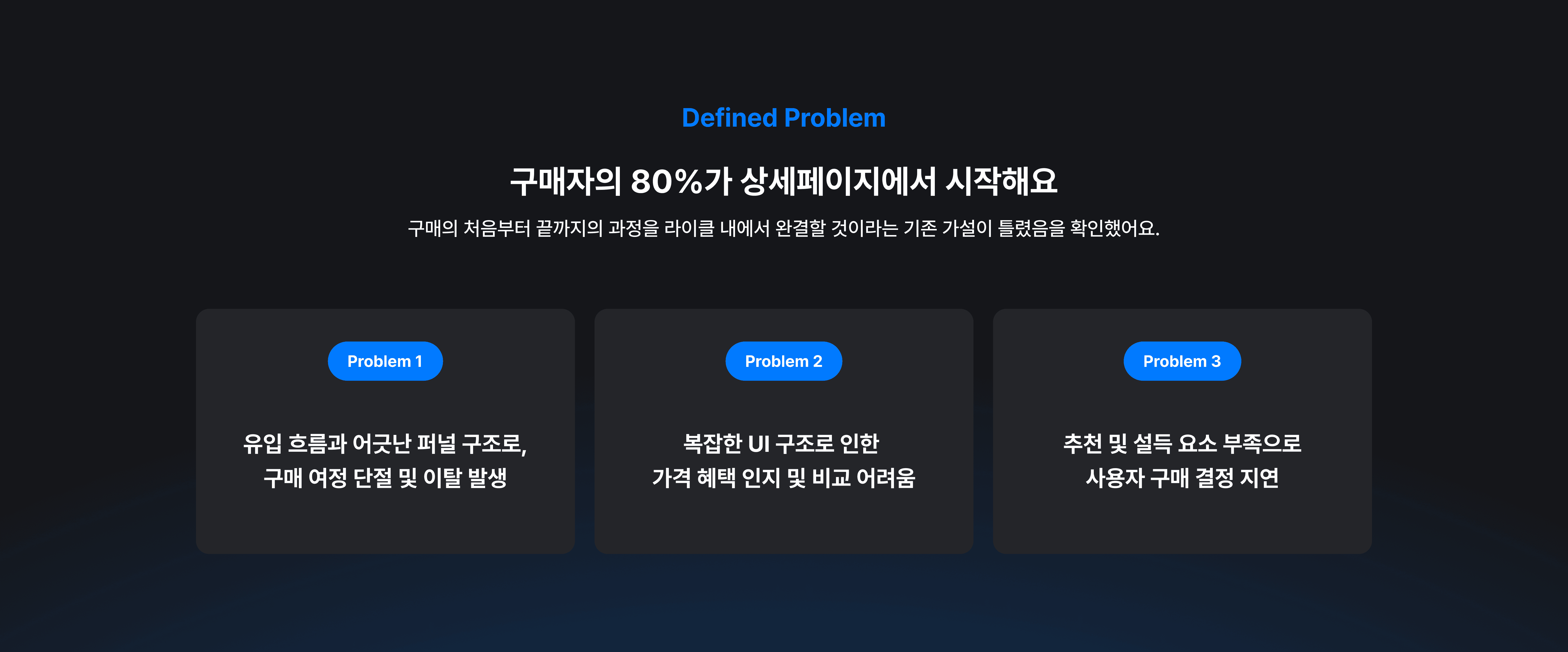 이 프로젝트는 상품 탐색부터 결제까지 이어지는 End-to-end 구매 퍼널의 전환율을 개선하기 위해 시작했어요. 퍼널 데이터, 행동 로그, 그리고 간단한 인터뷰를 통해 유저가 실제로 어디서, 왜 이탈하는지 정량·정성적으로 분석했고, 단순 UI 문제가 아닌 설득 흐름 자체의 구조적 단절이 원인임을 확인할 수 있었어요.