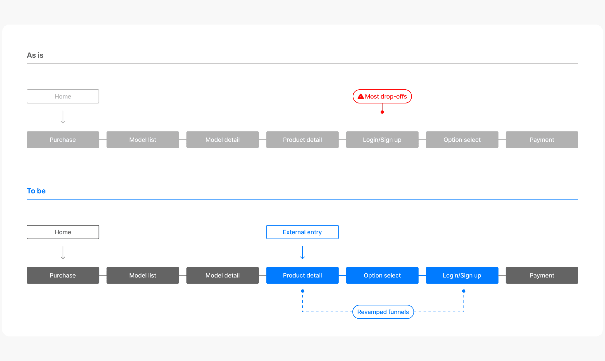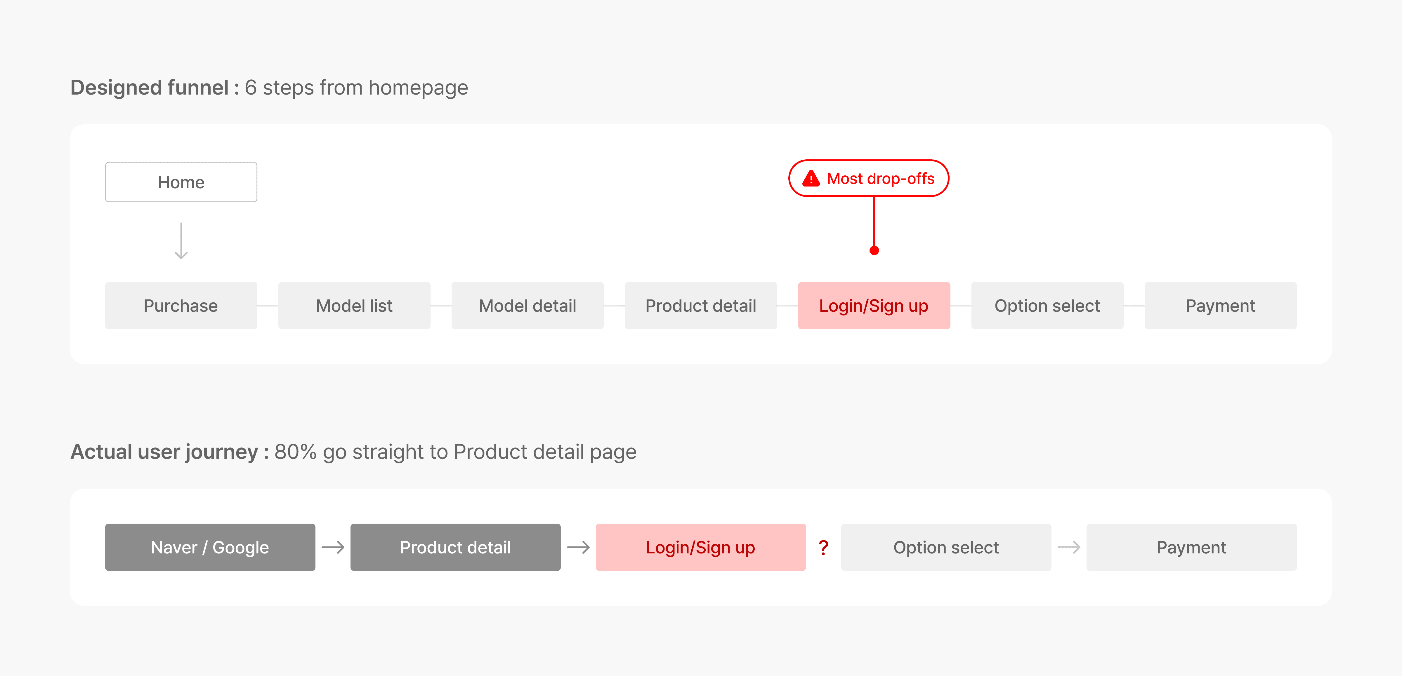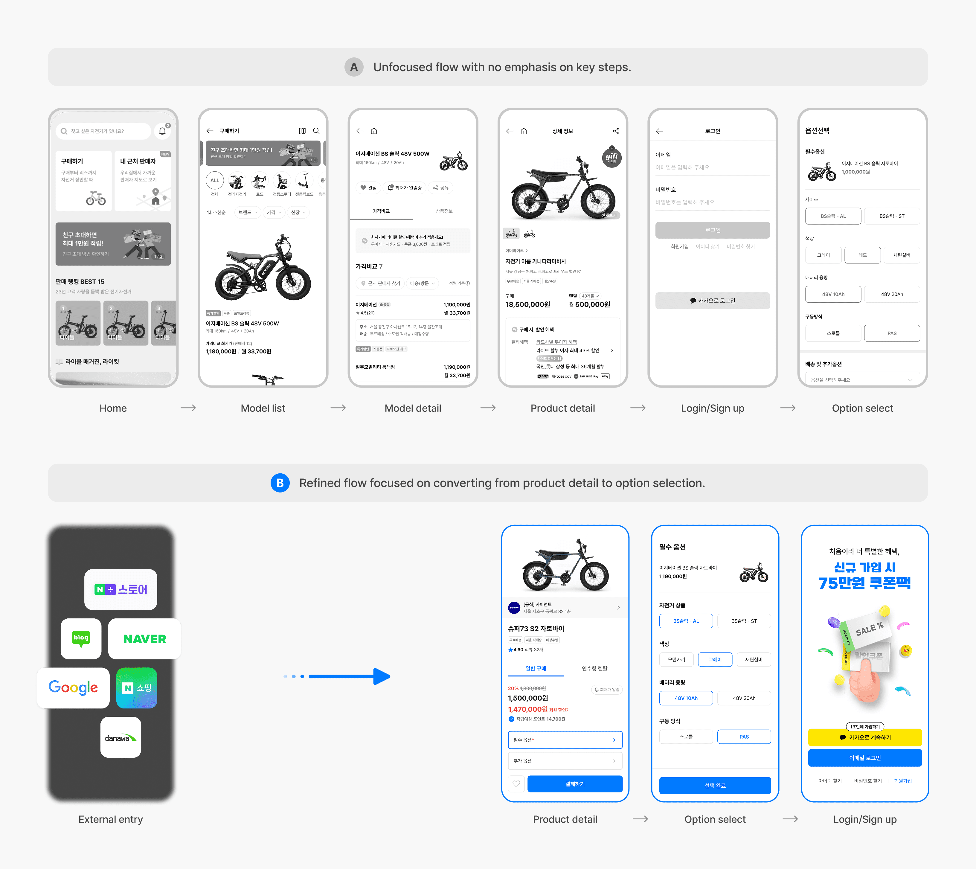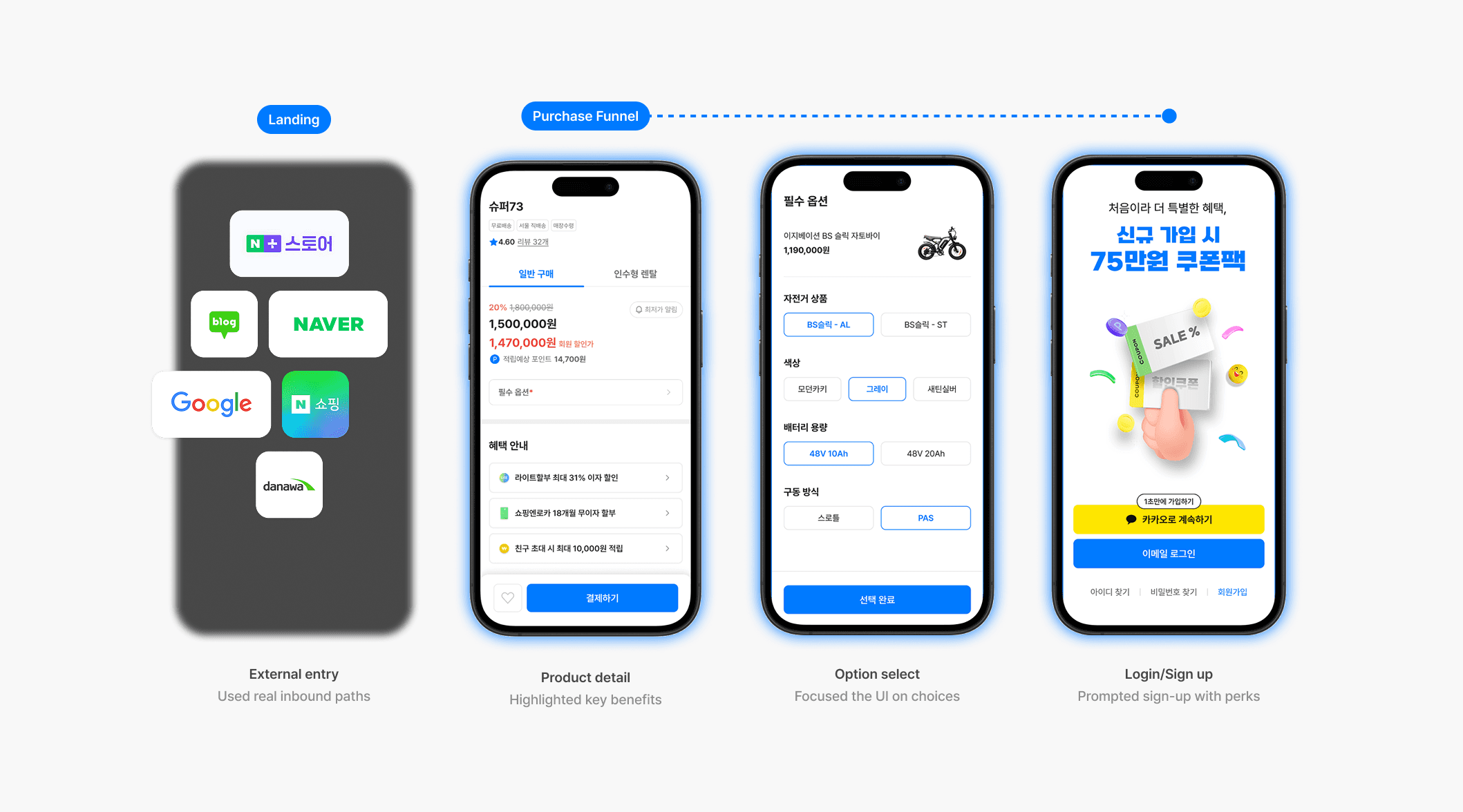 I requested a two-year funnel trace from the backend team: every completed purchase from 2022 to 2024, mapped to its entry point. Over 80% started directly from the product detail page. Korean bicycle shoppers search on Naver or Google, click a top-ranked result, and land straight on the product. We had designed an entire journey for an entry point that 8 out of 10 buyers never used.