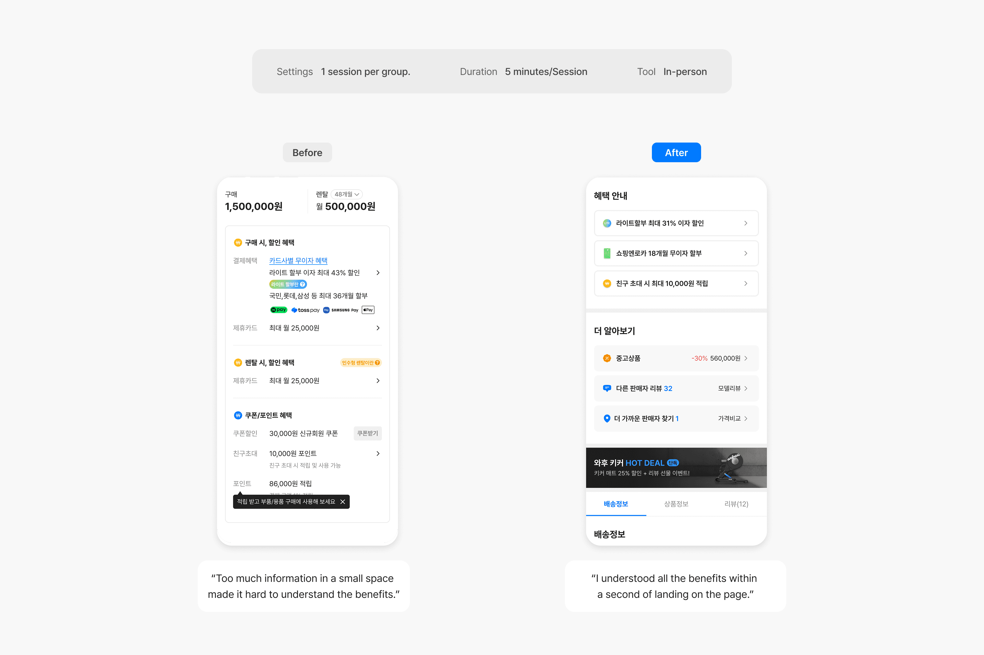 Usability testing came first. Representative tasks that previously required navigating to a separate page were completed in seconds with the new card layout. A/B test confirmed: benefit interaction rate increased +200%, and review clicks rose +66%.