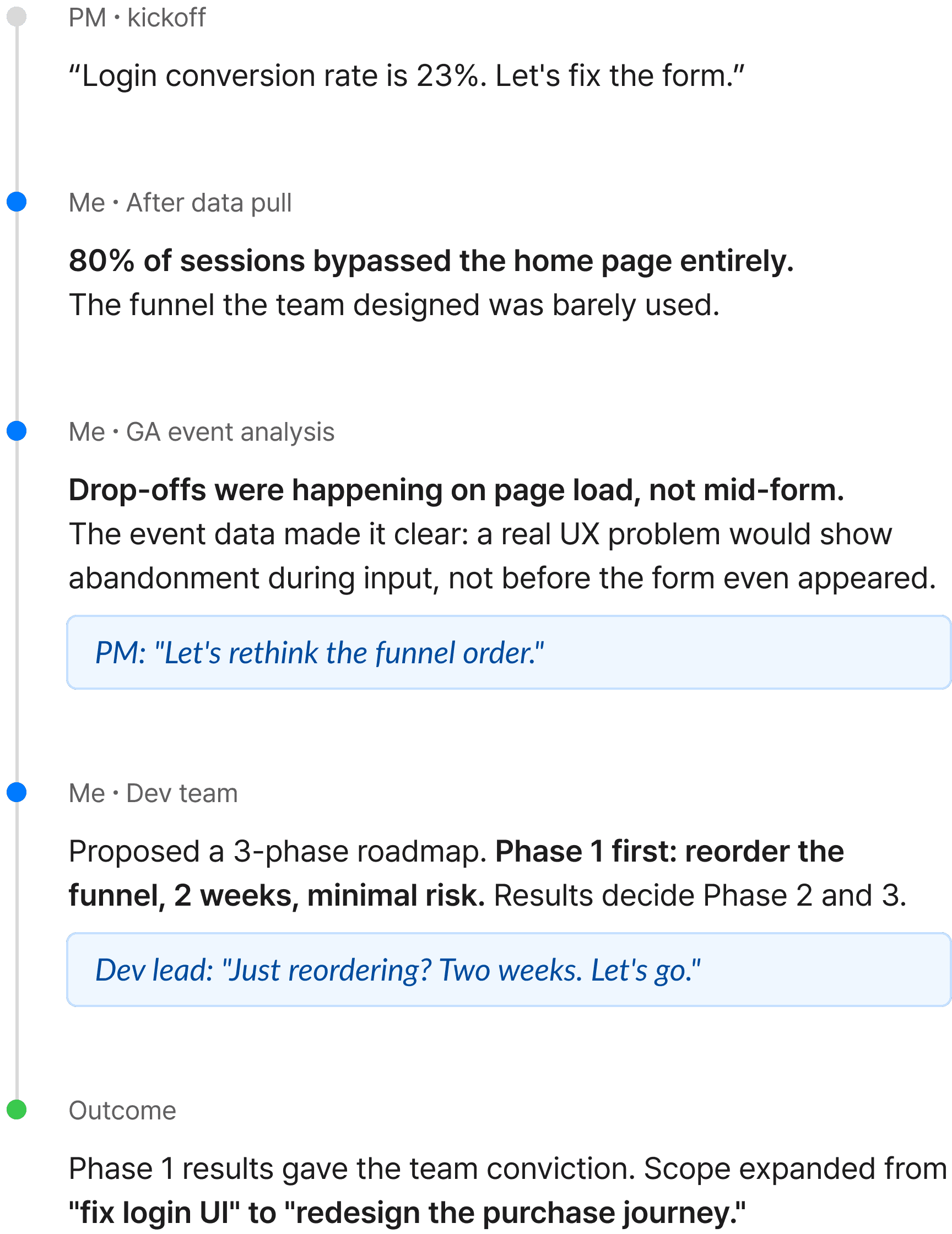 The PM identified login/signup as the highest drop-off point and proposed a targeted fix: redesign the page, add social login, lower friction. The logic was sound. But the behavior data told a different story. Users weren't struggling with the form. They were bouncing the instant the page appeared. That's not a UI problem. That's rejection of the step itself.