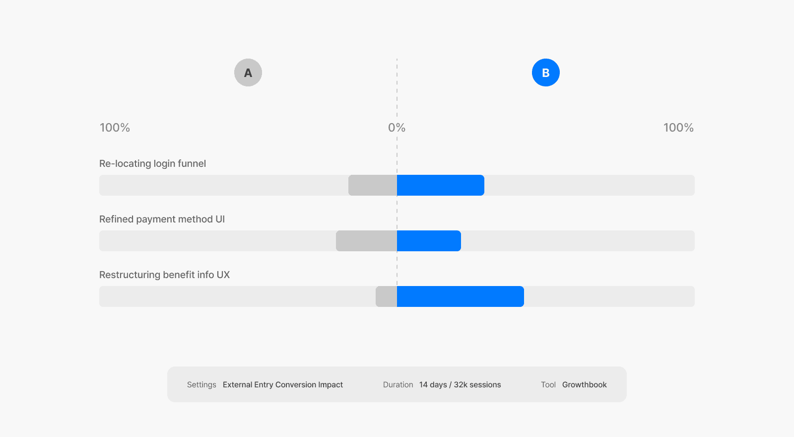 14-day A/B test, 32K sessions via GrowthBook. Control kept login before option selection. Variant moved it after. The variant showed a clear lift in checkout conversion and a significant increase in option selection entry rate, confirming the structural hypothesis.